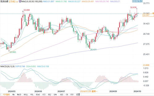 从日线图观察,白银价格已突破34.5美元的关键阻力位,形成“上升三角形”突破形态。MACD指标中,快线自8月以来首次上穿慢线,红色动能柱持续放大;RSI指标升至68,接近超买区间但未现背离,暗示上涨动能充足。